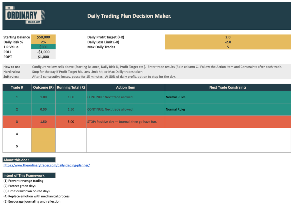 At this point, the planner prompts a decision. Either stop trading for the day, or reduce risk by lowering position size. The goal is to protect gains already earned and reduce the likelihood of giving them back through overconfidence or fatigue.